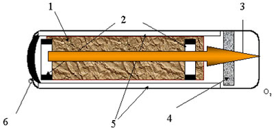 Рис.1.Схема СО2-лазера небольшой мощности с диффузным охлаждением: 1 - плазма; 2- кольцевые электроды; 3 - инфракрасный луч; 4 - полупрозрачные зеркала из ZnSe или AsGa; 5 - охлаждение; 6 - отражатель