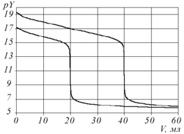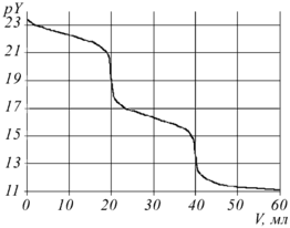 Не менее важно применение программы для оптимизации методик анализа смесей металлов. Известно, что комплексонометрический анализ смеси металлов без их предварительного разделения можно провести, варьируя рН раствора. Так, в нейтральной среде определяется сумма In(III) и Cd(II), а в сильнокислой - титруется только индий, содержание же кадмия определяется по разности [10]. Результаты компьютерного эксперимента согласуются с этими данными (рис. 2). Отметим, что при рН 5 на кривой титрования наблюдаются 2 скачка, что позволяет определять индий и кадмий порознь даже за одно титрование. Оптимальная кислотность раствора для раздельного определения других металлов в их смесях могут прогнозироваться аналогичным способом.