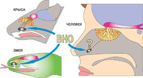 Остановимся вкратце на проблеме восприятия феромонов. У рептилий и большинства млекопитающих в носовой полости есть ещё одна вспомогательная полость — вомероназальный орган, или ВНО. Нервы, идущие от ВНО, несут импульсы во вспомогательную обонятельную луковицу, от которой импульсы следуют в подкорковые области мозга, в том числе в гипоталамус. У некоторых животных вход в полость ВНО располагается близко к границе ротовой и носовой полостей. Поэтому туда могут поступать как вещества, переносимые воздухом (обнюхивание), так и те, что поступают через рот (ещё один довод в пользу важности поцелуев, облизывания и прочих оральных контактов).