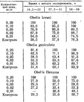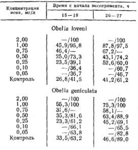 Таблица 1.Доля рассосавшихся гидрантов (в %) при действии ионов меди на гидроидов (температура 14—16°С)