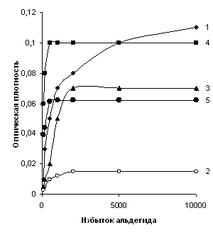 Величину избытка реагентов, достаточную для фотометрического определения, оценивали по кривым зависимости оптической плотности от соотношения альдегида – НДМГ. Было установлено, что в случае использования о‑нитробензальдегида достаточным является 10000-кратный избыток, для его м- и п-изомеров – 2000-кратный, для 5‑фенилпентадиен-2,4-аля – 1000-кратный и для коричного альдегида – 500-кратный избыток (рис. 2).