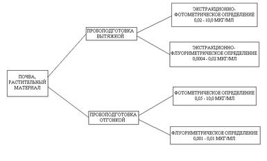 Анализ почв и растительного материала на содержание в них НДМГ при концентрациях определяемого вещества ниже 0,02 мкг/мл включает в себя пробоподготовку известными способами: приготовление кислотной вытяжки НДМГ из образца и дальнейшее определение экстракционно-флуориметрическим способом, или отгонка НДМГ из щелочной/кислотной вытяжки в раствор реагента с последующим флуориметрическим определением (рис. 9).