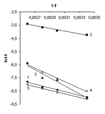 Значения энергии активации реакции конденсации НДМГ с ароматическими альдегидами определяли графически из уравнений, описывающих кривые, построенные по логарифмическому выражению уравнения Аррениуса: