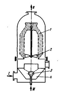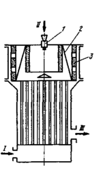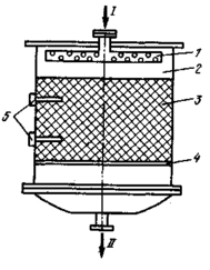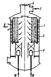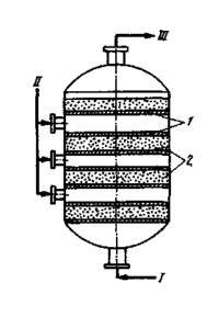 Самым простейшим аппаратом является реактор с неподвижным слоем катализатора (рис. 3). Однако в нем трудно равномерно распределить поток газов и избежать градиентов температуры по слою катализатора, а также предотвратить разложение реагентов на перегретых участках при снижении скорости реакции на ненагретых. Более сложен полочный реактор с несколькими слоями катализатора (рис. 4). В нем поток газа лучше распределяется и охлаждается между слоями, причем можно вводить горячий и холодный газ, а в разных слоях поместить разные катализаторы; кроме того, можно избирательно заменять слой дезактивированного контакта и поддерживать различную температуру в слоях.