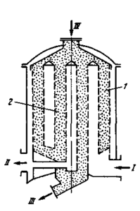 1— корзины с катализатором; 2 — внутреннее кольцо с катализатором; I, II—соответственно вход и выход газов; III—выгрузка катализатора; IV—загрязненные газы