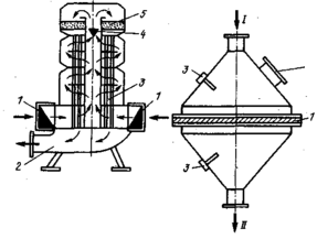 Минский конструкторско-технологический экспериментальный институт разработал простейшие реакторы УСК-39, УСК-41 и др. На рис. 5 показан реактор с двухкольцевым размещением катализатора конструкции Дзержинского филиала НИИОгаза. В этом же институте создан реактор для дожигания газов от сушильных камер окрасочных линий машиностроительных заводов (рис. 6). Подача газов осуществлена по кольцевому каналу, где они смешиваются с дымовыми газами от сжигания жидкого или газообразного топлива.