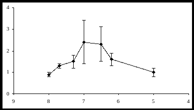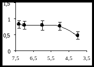 ось абсцисс – отрицательный десятичный логарифм концентрации серотонина в нормальном физиологическом растворе; ось ординат – отношение амплитуды мышечных сокращений в растворе серотонина к амплитуде мышечных сокращений в физиологическом растворе; вертикальные линии – стандартное отклонение (n = 5)