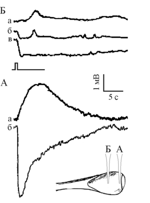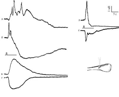 Нейропиль. На первых этапах погружения электрода в глазной бокал наблюдался отрицательный ПП величиной до 10 мВ. В этой точке регистрировали ЭРГ, по крайней мере, трех видов.