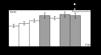 Одно из высоких содержаний радионуклида отмечено в почвах берега озера Верхнего – 400 – 600 Бк/кг (рис. 1в). Это водоём, в который стекают воды с большой территории города, принося с собой калий-40. По глубине исследования радионуклид распределен неравномерно. Отмечается и прямая зависимость содержания калия-40 от механического состава почвы. Почвы по накопительной способности распределились следующим образом: супесь – лёгкий суглинок – тяжелый суглинок.
