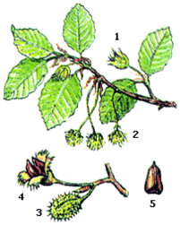 Ветка бука с женскими (1) и мужскими (2) соцветиями. Плоды с нераскрывшейся (3) и раскрытой (4) плюской, буковые орешки (5)