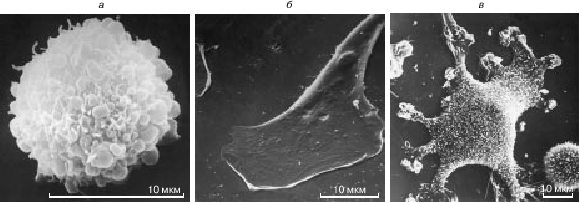 Рис. 1. Топография поверхности нормальных и трансформированных фибробластов в культуре. Сканирующие электронные микрофотографии Ю.А. Ровенского: а - нормальный мышиный фибробласт в жидкой среде. Сферическая клетка с многочисленными пузырчатыми выпячиваниями на поверхности. Увел. 3800; б - нормальный мышиный фибробласт, прикрепившийся к плоскому дну сосуда. Клетка распласталась на подложке, ее поверхность стала гладкой. Впереди - уплощенная ламелла с рядом плоских псевдоподий; сзади - узкое тело клетки. Увел. 1600; в - трансформированный мышиный фибробласт, прикрепившийся к плоскому дну сосуда. Клетка плохо распласталась на подложке, и ее поверхность не стала совершенно плоской. На этой поверхности видны многочисленные короткие ворсинки, а на концах отростков - фестончатые псевдоподии. Увел. 800