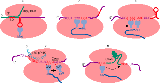 Иногда инициация с метионина может происходить и на других кодонах: AUA и AUU (кодонах изолейцина), UUG и, возможно, CUG (кодонах лейцина). Стало очевидным, что для узнавания кодона в качестве инициирующего важен не только сам и, может быть, не столько сам кодон, но какой-то контекст, делающий его инициирующим. Оказалось, что у прокариот для эффективной инициации кодон должен находиться на вершине шпилечной структуры, образуемой смежными комплементарными участками мРНК, а предшествовать ему примерно за 3-10 нуклеотидов должна полипуриновая последовательность (последовательность Шайна-Дальгарно, SD) (рис. 3, а). Эта последовательность комплементарна рибосомной РНК и, по-видимому, способствует связыванию рибосом в районе инициирующего кодона. Вторичная структура мРНК в районе инициирующего кодона и как следствие - степень доступности инициирующего кодона для инициации может изменяться в процессе трансляции соседних цистронов или при взаимодействии мРНК со специальными регуляторными белками (см. ниже).