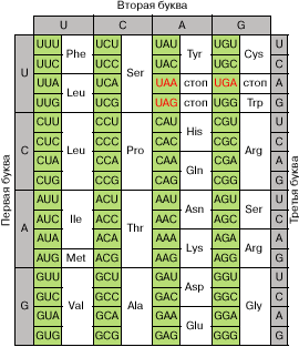 Полная расшифровка генетического кода, проведенная М. Ниренбергом и С. Очоа, была закончена к 1966 году. Она показала, что 61 из 64 возможных триплетов мРНК кодируют одну из двадцати стандартных аминокислот, включающихся в белок (рис. 2). Таким образом, генетический код оказался сильно вырожденным, и многие аминокислоты кодируются двумя или более кодонами. Три триплета, не участвующие в кодировании аминокислот, - UAA , UAG и UGA - оказались сигналами на окончание синтеза белка (сигналами терминации).