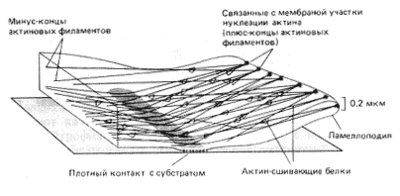 Рис. 15. Схема расположения актиновых филаментов в тонких пластинчатых отростках (ламеллоподиях) клеток, растущих в культуре