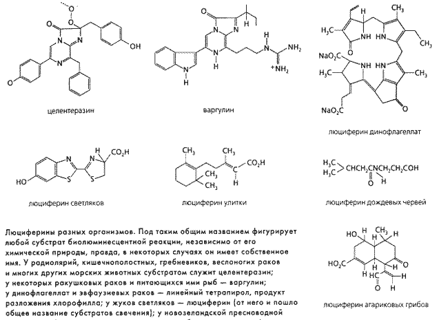 Удивительно, что далеко не все светящиеся животные сами синтезируют свои люциферины. Особого внимания заслуживает в этой связи целентеразин (от Coelenterata – кишечнополостные), производное имидазолпиразина. Он выполняет функцию люциферина не только у кишечнополостных, но также у радиолярий, гребневиков, щетинкочелюстных червей, некоторых рыб и кальмаров, креветок и, наконец, веслоногих и ракушковых планктонных рачков. Возможно, многие из перечисленных животных не способны сами синтезировать целентеразин, а получают его, питаясь этими рачками. Такое предположение высказал в 2001 г. американский ученый С.Хэддок, когда обнаружил, что медуза экворея утрачивает способность к биолюминесценции, если в ее рацион не входят светящиеся веслоногие рачки.