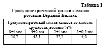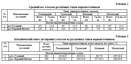 Типоморфизм алмазов разных первоисточников изучен по двум участкам - Верхний Биллях и Гусиный [2]. На участке “Верхний Биллях” наряду с общей закономерностью пониженного среднего веса наблюдается снижение весов алмазов по ламинарному, “жильному” и “эбеляхскому” типам. Средний вес алмазов уральского типа несколько выше (табл.2).