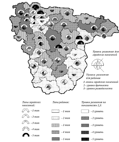 Географический анализ современного естественного воспроизводства населения (ЕВН) Воронежской области в 90-е годы ХХ века послужил основой для проведения автором комплексной типологии городских поселений и районов (принималось во внимание только сельское население административных районов), учитывающей всю совокупность процессов ЕВН. Данная типология является интегрирующим этапом изучения территориальной организации естественного воспроизводства населения областного региона. Поскольку городское и сельское население существенно различаются по характеру процессов ЕВН, то были выделены отдельно типы городских поселений и типы районов (рис.).