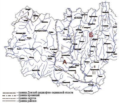 Донская ледниково-ландшафтная область. Провинции: А – Среднерусская, Б – Окско-Донская. Округа: I – Верхнеокский, II – Придонской правобережный, III – Калачский, IV – Воронежско-Донской, V – Цнинско-Хоперский. Районы: 1 – верхнеокский левобережный, 2 – Верхнеокский правобережный, 3 – Соснинско-Девицкий, 4 – Осколо-Потуданский, 5 – Острогожский, 6 – Битюго-Толучеевский, 7 – Донской левобережный, 8 – Воронежско-Усманский, 9 – Цнинско-Воронежский, 10 – Битюгский, 11 – Цнинский, 12 – Вороно-Цнинский, 13 – Вороно-Савальский.