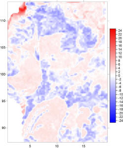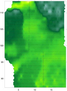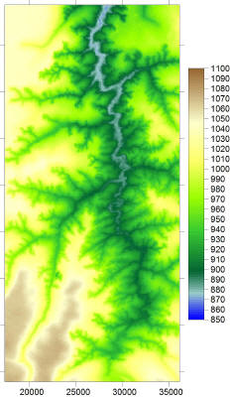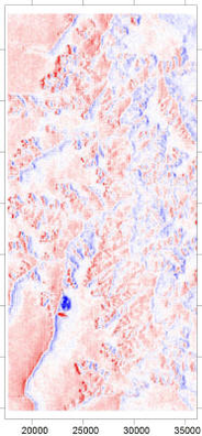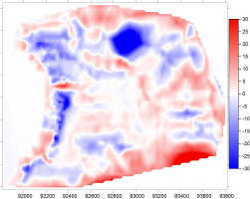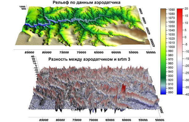 На рисунке 1 приведены изображения рельефа, полученные в результате аэросъемки, и построенные по данным SRTM, а также их разность. Несмотря на то, что общая картина местности на обеих картах повторяется, заметны некоторые различия, и, в частности имеет место постоянный сдвиг около 20 м. Максимальные расхождения между двумя съемками достигают по амплитуде 30 м, причем имеют разный знак. Расхождения приурочены в основном к областям с переменным рельефом (долины рек), что может быть объяснено неточным определением плановых координат точек в методе SRTM.
