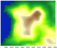 | Рисунок 3. Сравнение рельефа участка по данным детальной топографической съемки по сети менее 100 м и данным SRTM версии 2. Купольный участок, о.Уруп (площадь съемки 4 км2). Единицы измерения по осям - метры. | ||