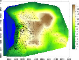 Геофизические исследования выполнены МП (г.Южно-Сахалинск) в 2004 году. Топографическая съемка масштаба 1:5000 (и 1:2000 на часть участка) была самостоятельной задачей в рамках данных работ, и выполнена по стандартной методике, с применением тахеометров и геодезических приемников GPS Trimble 5700. Общая площадь съемки - около 4 км2. Сопоставление с данными SRTM приведено на рис 3. На данном примере видно, что сеть радарной съемки существенно реже, чем топосъемки и, хотя общий контур местности повторяется, топосъемка дает существенно более детальный результат. Расхождение между двумя моделями достигает 60 м, стандартное отклонение 10 м.