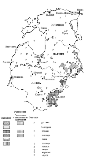 Республики Прибалтики отличались от других частей СССР в этнокультурном отношении, но одновременно и между собой у них довольно мало общего. Скажем, в отличие от большей части Советского Союза, где в основе алфавита лежит кириллица, на их территории автохтонным населением используется латиница, но употребляется она для трех разных языков. Или, например, верующие литовцы, латыши и эстонцы чаще всего не являются православными, как русские, но отличаются по вероисповеданию и между собой: литовцы – католики, а латыши и эстонцы относятся преимущественно к протестантам (лютеранам).