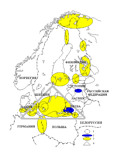 Для оценки будущего процессов экономической интеграции в Балтийском регионе представляют интерес стратегические научные разработки в этом направлении. Их идеологами выступают прежде всего представители научных кругов Северных стран, озабоченных периферийностью географического положения их государств в Евросоюзе и наличием в настоящее время иных полюсов роста европейской экономики. По мнению западных исследователей, прежняя ось развития, шедшая от юго-восточной Англии через страны Бенилюкса и приграничные территории Германии и Франции (“голубой банан”), в значительной мере уступила свою роль прибрежным территориям Западного Средиземноморья. В противовес этим осям развития (или в дополнение к ним) в качестве новой приоритетной зоны предлагается бассейн Балтийского моря. А в этом регионе – “южнобалтийский треугольник роста” (Kivikari U., 1998), включающий прибрежные территории южной части Балтийского моря (рис. 16).