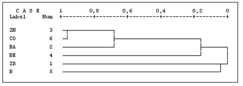 Одного корреляционного анализа недостаточно для выделения ассоциации элементов, поэтому на данном этапе был использован метод построения дендрограммы, основанный на проверке степени значимости и объединения в ассоциацию элементов, связанных наиболее тесными положительными связями. Дендрограмма построена также с помощью программы SPSS (см. рис. 1). Она является составляющей метода кластерного анализа. Кластеры, получающиеся в результате слияния, отображаются горизонтальными линиями. При этом каждый шаг на шкале равен 0, 2 коэффициента корреляции.