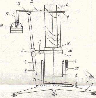 Подвижная часть основания снабжена указателем азимутов 21, а стойка 2 - указателем зенитных узлов 22.