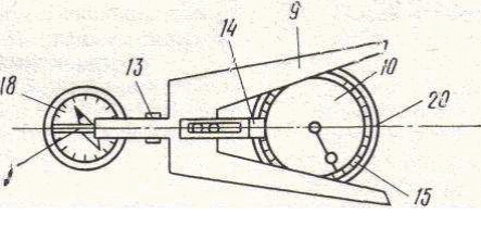 На стороне хомута 7 диаметрально противоположной стойке 8 в плоскости, проходящей через ось симметрии замерочной плоскости 9, шкалы 19 и стойки 8, нанесена метка 20.