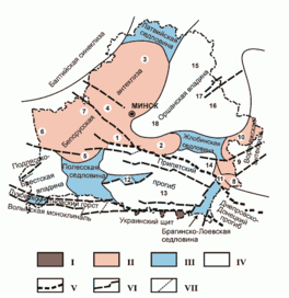 Территория Беларуси расположена на западе древней Восточно-Европейской платформы. Геологическое строение таких платформ двухъярусное. Здесь на кристаллическом фундаменте, сложенном метаморфическими и магматическими породами и имеющем архейско-раннепротерозойский возраст, залегает платформенный чехол. Последний почти целиком состоит из осадочных пород, которые в ряде районов прорываются магматическими образованиями или переслаиваются с ними. Глубина залегания кристаллического фундамента на территории Беларуси изменяется от нескольких десятков метров до 5-6 км, а на самом юге страны в пределах Украинского кристаллического щита породы фундамента выходят на поверхность.
