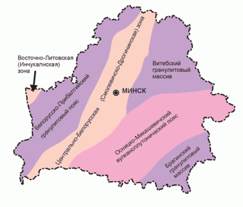 По вещественному составу в фундаменте Беларуси выделены три гранулитовые, две гранитогнейсовые и одна вулканоплутоническая геоструктурные области [13]. Это Белорусско-Прибалтийский гранулитовый пояс, Брагинский и Витебский гранулитовые массивы, Центрально-Белорусская (Смолевичско-Дрогичинская) и Восточно-Литовская (Инчукалнская) гранитогнейсовые зоны, Осницко-Микашевичский вулканоплутонический пояс (рис.1).