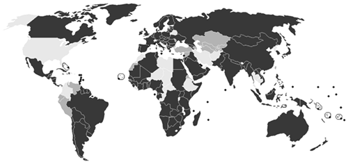 «Промежуточно серые» — страны, Конвенцию вообще не подписавшие (Казахстан, Средняя Азия, Турция, Венесуэла, Перу)