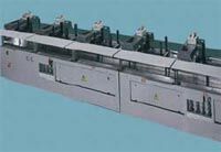 Подборочно-швейная машина Heidelberg Stitchmaster ST 400 (рис. 2) оснащена автоматическим устройством предварительной установки формата на передвижных самонакладах. Автоматическая синхронизация самонаклада относительно скорости подборочного цепного транспортера обеспечивает надежность процесса и тем самым - постоянное высокое качество продукции. На станции сшивания продукт скрепляется еще во время движения. Используемая здесь проводка посредством цепного транспортера дает возможность бокового контроля толщины без ограничения формата, и это существенно облегчает контроль качества.