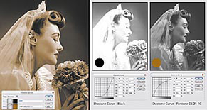 Умение правильно подобрать краски для дуплексной печати и грамотно выстроить градационные кривые, подобрав таким образом, относительный контраст того или иного цветового канала является настоящим искусством. И если рекомендации по выбору цвета зависят от конкретных предпочтений дизайнера, то работа с градационными кривыми подчиняется простым, почти математическим законам. Специалисты по цветокоррекции хорошо знают, каким образом можно с помощью градационной кривой выделить теневые участки для их использования на форме, с которой в печати будет накатываться более темная краска, и как можно получить "мягкую" форму, которая будет прорабатывать света будущего дуплексного изображения. На рисунке ниже показан пример преобразования исходного изображения в двухцветное, с указанием цветов и градационных кривых, примененных для каждого изображения. По этим изображениям хорошо проиллюстрированы два примера преобразования черно-белого изображения в Duotone - один достаточно неудачный, второй - более взвешенный, в результате чего были получены лучшие результаты. Попробуйте самостоятельно выбрать тот вариант, который Вам больше нравится, а затем сравнить свои собственные выводы с тем мнением, которое будет изложено далее по тексту статьи.