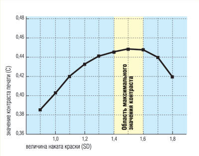Оказывается, хорошим показателем является контраст печати. Постепенно увеличивая подачу краски, проводят многократные измерения контраста печати. Затем строят график: по одной оси —величина наката краски, по другой — получившееся значение контраста печати(рисунок). При увеличении наката краски контраст сначала растет, затем стабилизируется, а потом начинает снижаться. В области максимального значения контраста находится наилучшее для данной машины соотношение наката краски и величины растискивания. Если это значение принять за стандартное для данного полиграфического предприятия, можно будет надежно получать очень насыщенные и яркие оттиски. Эти параметры необходимо учитывать и на стадии допечатной подготовки.