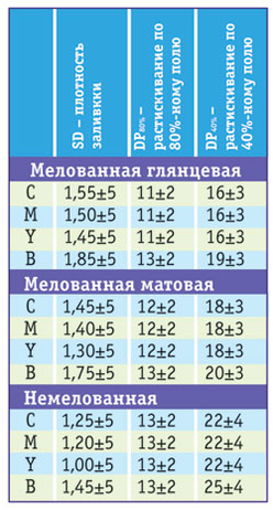 В настоящее время типографии опираются на стандарты оптических плотностей в офсетной печати и показатели допустимого растискивания, средние значения которых приведены в табл. 1 для разных типов бумаг. Из данных, приведенных в табл. 1, по формуле Мюррея-Девиса: