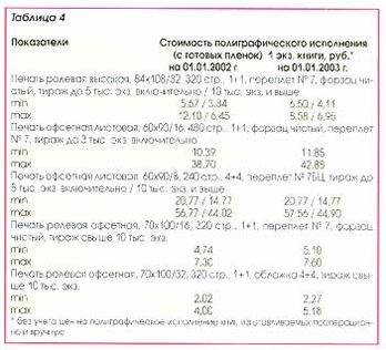 Проведенный анализ показал, что в 2002 г. более 80 % предприятий базы исследования увеличили расценки на полиграфическое исполнение книг. Разброс стоимости полиграфического исполнения 1 экз. книги в 2002 г. в разрезе некоторых типовых вариантов технических параметров представлен в таблице 4.