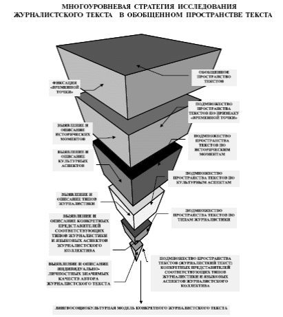 С учетом приведенных выше основных положений и принципов сформулированы особенности процесса лингвосоциокультурного моделирования журналистского текста: обобщенное пространство текста позволяет нам зафиксировать определенную “временную точку” анализа. По признаку “временной точки” определяются характерные исторические особенности развития социума. По признаку исторического момента выявляется пространство текста и описываются культурные аспекты модели. В связи с культурными аспектами устанавливаются социокультурные типы журналистики, затем конкретизируются особенности издания (редакционный коллектив, языковые приоритеты) и последнее – индивидуальноличностные (субъективные) значимые качества языковой личности автора журналистского текста. Таким образом, многоуровневая стратегия исследования журналистского текста в обобщенном пространстве текстов приводит нас к созданию лингвосоциокультурной модели конкретного текста Нелинейность замысла автора и, соответственно, нелинейность организации структуры текста, пространства структуры текста вызывает необходимость учета основных положений синергетики при построении лингвосоциокультурной модели журналистского текста.