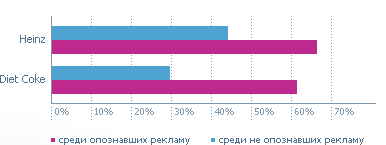 Гипотеза 2. Узнаваемость марки. Сравнение данных по Diet Coke и Heinz показало, что рекламный акцент в product placement сильно влияет на узнаваемость марки. Этот эффект дополняется другим: даже при простом product placement частота узнаваемости марки было значительно выше, чем в случаях его отсутствия (т.е. продукт в кадре был, но режиссер никаким способом не привлекал к нему внимание зрителя).