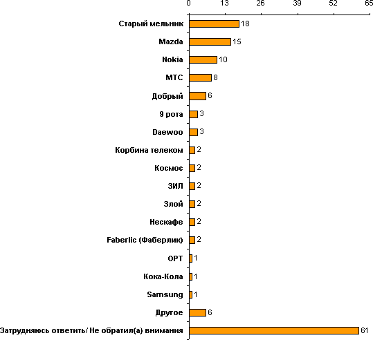 Поскольку вопрос был открытым (без подсказок), интернет-респонденты могли дать любое количество ответов и самостоятельно записать свои варианты. Наиболее любопытными оказались ответы, набравшие менее 1% голосов – их, по сути, дали единичные респонденты. Итак, были названы ряд пивных брэндов, был указан целый список автомобильных марок, производителей мобильных телефонов и компаний, предоставляющих услуги связи.