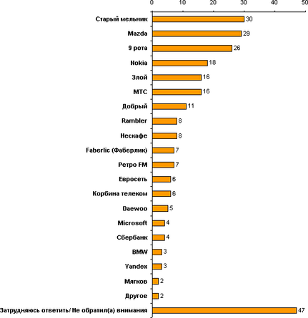 Бренды, которые назвали менее 1% респондентов: Audi, Marlboro, Nemiroff, Red Bull, Samsung, Желтое такси, ЗИЛ, Кока-Кола.