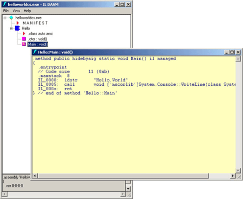 На втором плане — главное окно IL Disassembler. Если дважды щелкнуть метод Main в иерархическом дереве, на переднем плане появится окно, отображающее подробности метода Main.