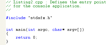 Сразу хочу обратить ваше внимание на то, что подключение iostream и cstdlib можно (пожалуй, уже нужно) объявить не в файле Listing2.cpp, а в stdafx.h. Эти файлы мы изменять не будем, а значит, имеем полное право. Тогда проект компилироваться будет быстрее, хотя в случае нашего проекта-малютки это и не будет заметно. В таком случае уберите эти две строчки
