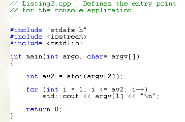 Теперь про параметры командной строки, думаю, всё понятно. Тем не менее, охота небось программку сделать? Давайте сделаем. Полезно будет. Сейчас и посмотрите, как в простейшем случае можно параметры командной строки использовать. Итак, заготовка исходного файла у нас уже есть (Listing2.cpp), дополните его, чтобы он выглядел так: