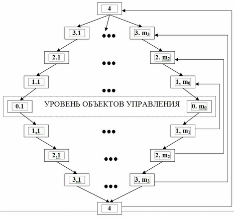 С учетом этих особенностей современного этапа развития систем управления и необходимо осуществить выбор структуры системы управления. Обычно в крупных организациях используется простая иерархическая структура [3]. Возможно применение других иерархических систем управления, например, даймонд-структуры [4]. Даймонд-структура представлена на рис. 1. Даймонд-структура состоит из четырех уровней. На первом уровне обеспечивается решение задач локального регулирования, т.е. стабилизация, программное регулирование параметров, которое задается на более высоких уровнях.