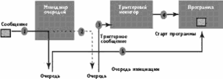 Чтобы определить триггерное событие, для прикладной очереди при помощи административных команд устанавливаются опции, разрешающие триггеринг и условия триггерного события. Кроме того, администратором системы создается специальное описание обработки такого события. В описании содержится информация о приложении, которое будет вызвано при наступлении триггерного события. Если происходит такое событие, например, появляется новое сообщение в очереди, менеджер очередей автоматически генерирует специальное триггерное сообщение, которое помещается в очередь инициации (initiation queue). В триггерном сообщении содержатся данные о событии и вызываемом процессе. Все очереди инициации отслеживаются триггерным монитором, который читает триггерное сообщение и вызывает внешнюю программу обработки (рис. 2).