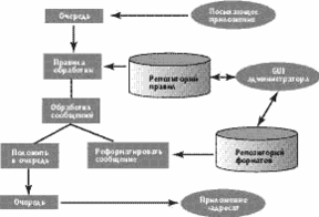 Однако только гарантированной доставкой информации и компонентами сопряжения с существующими системами проблемы интеграции приложений не исчерпываются. Важнейшей является задача распознавания и обработки прикладного содержания сообщений. Для ее решения используется MQSeries Integrator (рис.4) - брокер сообщений, имеющий репозиторий форматов, на базе которого происходит распознавание и переформатирование содержания сообщений. В этом брокере имеется также база правил, определяющих процедуры обработки и маршрутизации сообщений.