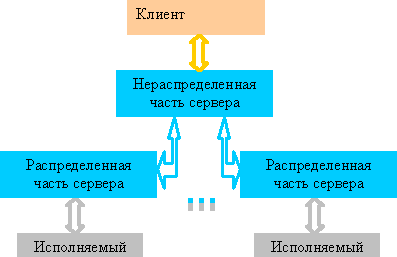 В ней сервер состоит из двух частей: нераспределенной, которая отвечает за управление параллельной программы как целым, и распределенной, которая отвечает за непосредственное управление выполнением каждого из процессов параллельной программы. Соответственно, нераспределенная часть должна поддерживать модель текущего состояния параллельной программы и, на основании информации, получаемой от распределенных частей обрабатывать "тривиальные параллельные" причины незавершения шага.