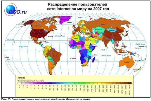 Распределение пользователей сети Интернет по миру, 2007 год.